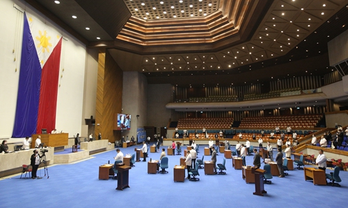 Members of the Lower House of Congress attend a special session with desks arranged to observe social distancing amongst members in Manila, the Philippines on Monday, to discuss a proposed emergency power to be given to President Rodrigo Duterte to tackle coronavirus outbreak. Photo: AFP