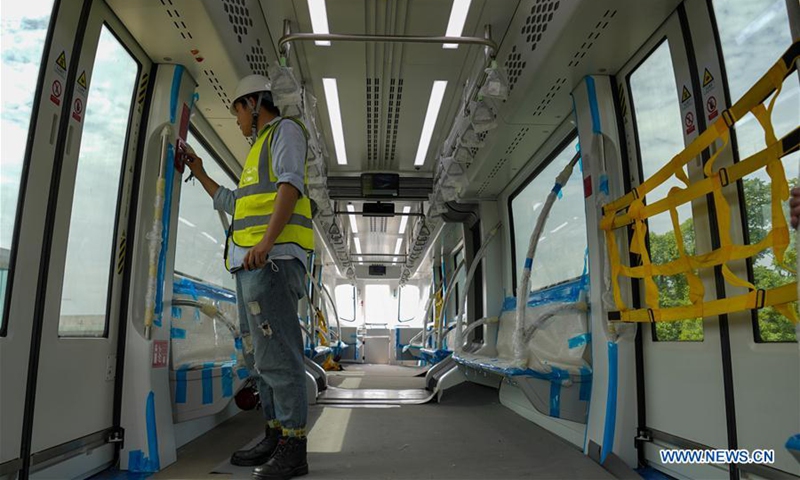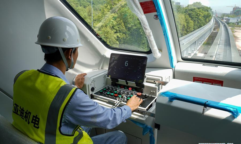 An engineer tests the autopiloting system of a BYD SkyShuttle train during a trial operation in Bishan District of southwest China's Chongqing, June 3, 2020. Chongqing's first SkyShuttle rail transit project has been unveiled recently, featuring electric-powered, rubber-wheeled trains running on a 15.4-km rail line with 15 stations. The project will provide passengers with quiet and safe travel services upon its estimated public operation in September 2020. (Xinhua/Liu Chan)