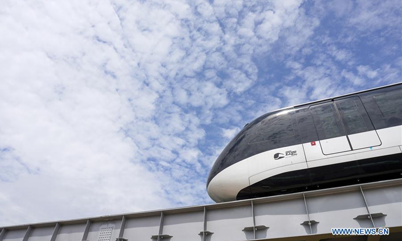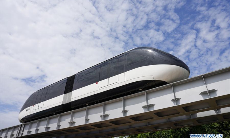 A BYD SkyShuttle train is seen during a trial operation in Bishan District of southwest China's Chongqing, June 3, 2020. Chongqing's first SkyShuttle rail transit project has been unveiled recently, featuring electric-powered, rubber-wheeled trains running on a 15.4-km rail line with 15 stations. The project will provide passengers with quiet and safe travel services upon its estimated public operation in September 2020. (Xinhua/Liu Chan)