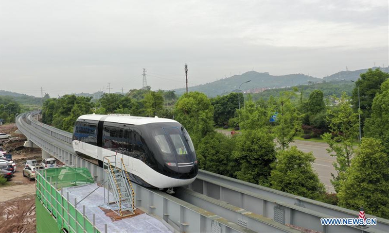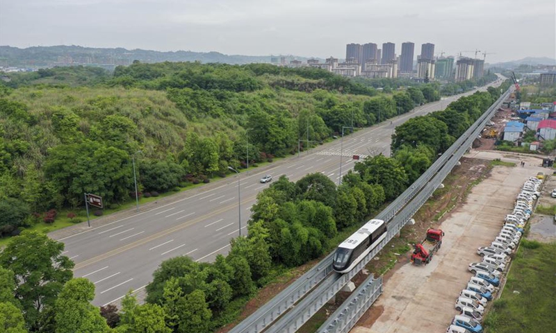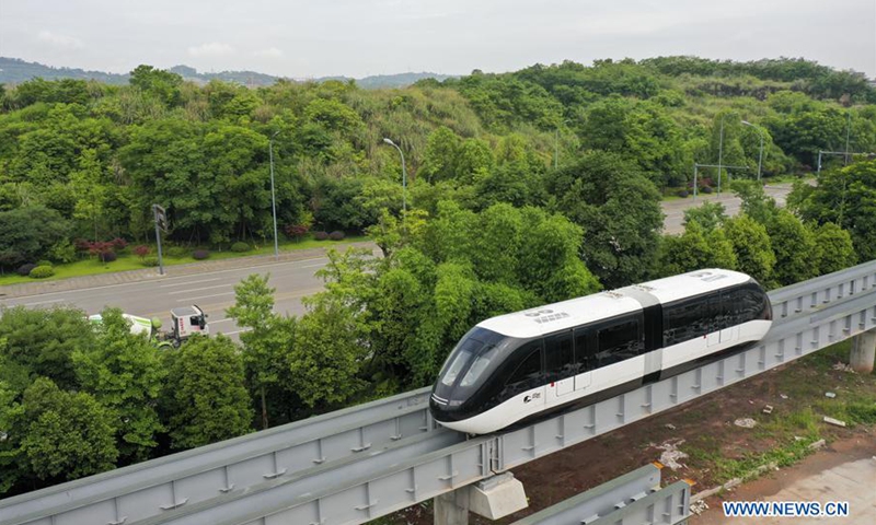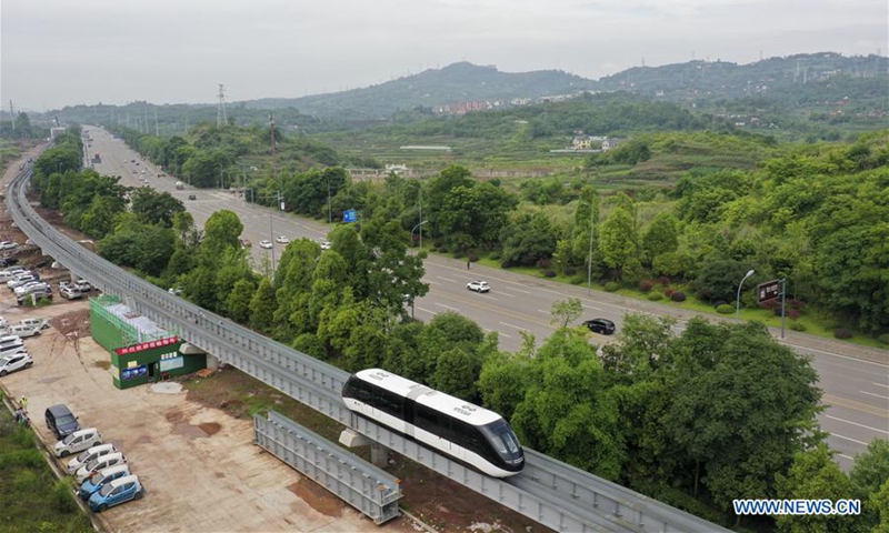 Aerial photo taken on June 3, 2020 shows a BYD SkyShuttle train during a trial operation in Bishan District of southwest China's Chongqing. Chongqing's first SkyShuttle rail transit project has been unveiled recently, featuring electric-powered, rubber-wheeled trains running on a 15.4-km rail line with 15 stations. The project will provide passengers with quiet and safe travel services upon its estimated public operation in September 2020. (Xinhua/Liu Chan)