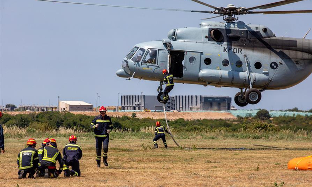 Croatian firefighters participate in an exercise in coordination with a military helicopter in Medulin, Croatia, on June 3, 2020. (Srecko Niketic/Pixsell via Xinhua)