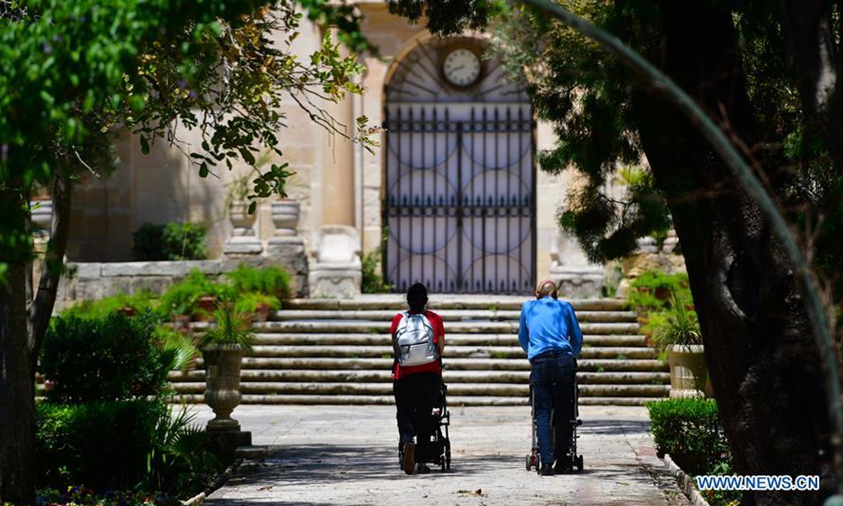 Two pedestrians pushing baby carriages wander at the San Anton Gardens in Attard, Malta, on June 3, 2020. (Photo by Jonathan Borg/Xinhua)
