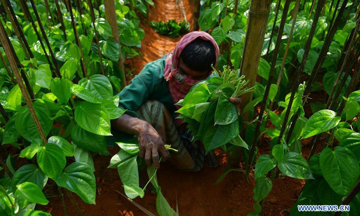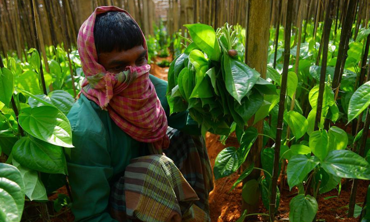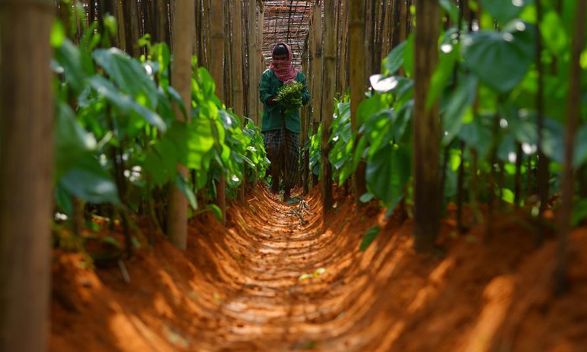 A farmer, who covers his face with cloth, works in a Paan (Betel leaf) field on the outskirts of Agartala, Tripura, June 3, 2020. (Str/Xinhua)