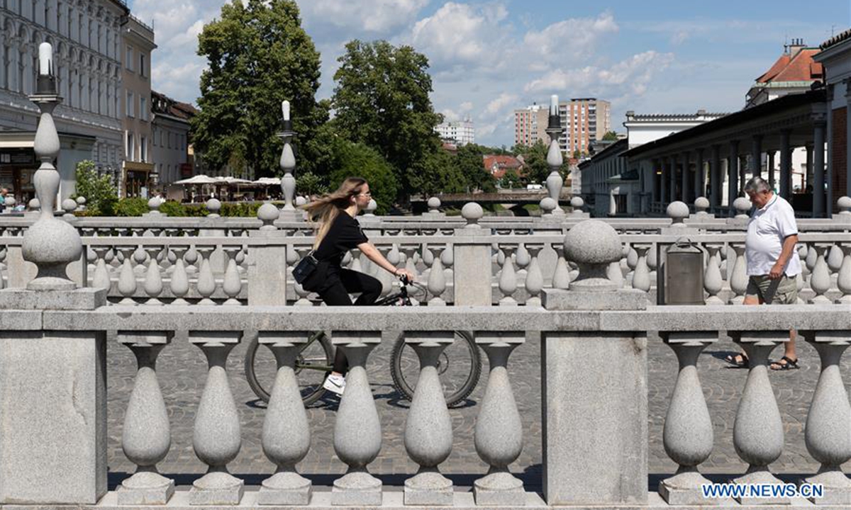 A woman riding bicycle passes the Triple Bridge in Ljubljana, Slovenia, on June 3, 2020. Slovenia further eased restriction measures imposed to contain the novel coronavirus epidemic from Monday. (Xinhua/Peng Lijun)