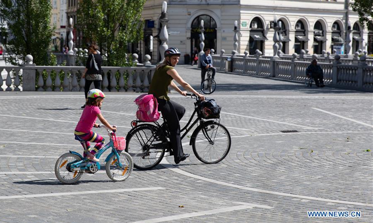 A woman and a child ride bicycles at Preseren Square in Ljubljana, Slovenia, on June 3, 2020. Slovenia further eased restriction measures imposed to contain the novel coronavirus epidemic from Monday. (Xinhua/Peng Lijun)