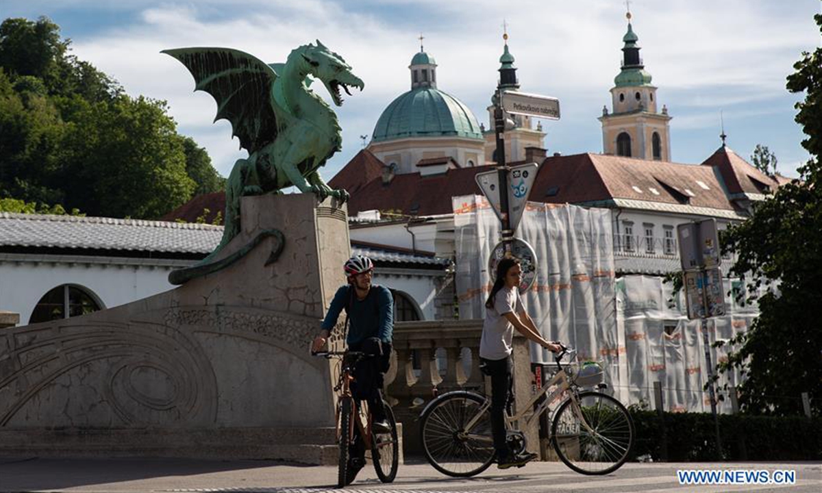 Cyclists pass Dragon Bridge in Ljubljana, Slovenia, on June 3, 2020. Slovenia further eased restriction measures imposed to contain the novel coronavirus epidemic from Monday. (Xinhua/Peng Lijun)