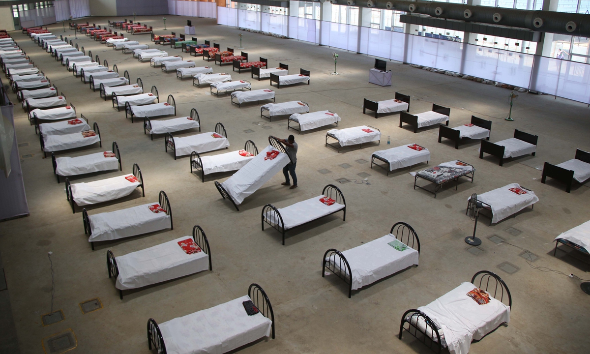 A worker arranges beds at a quarantine center set up in the Hapania International Fair Complex during a nationwide lockdown imposed as a preventive measure against the COVID-19 coronavirus, on the outskirts of Agartala, India, on Wednesday. Photo: AFP