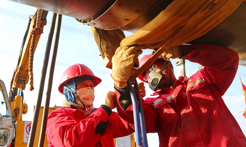 Workers install medium-frequency heating for the China-Russia east-route natural gas pipeline on Wednesday in Qinhuangdao, North China’s Hebei Province. The pipeline began operating in December 2019. The project is scheduled to provide China with 5 billion cubic meters of Russian gas in 2020, rising to 38 billion cubic meters annually from 2024. Photo: cnsphotos