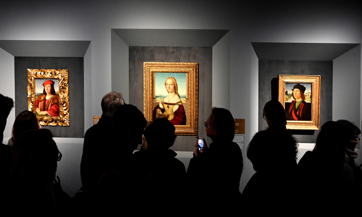 Visitors look at the paintings (from left) Young Man with an Apple, Young Woman with Unicorn and Portrait of a Man by Renaissance master Raffaello Sanzio da Urbino, known as Raphael, on March 4 at the exhibition Raffaello 1520-1483 at the Scuderie del Quirinale in Rome. Photo: AFP