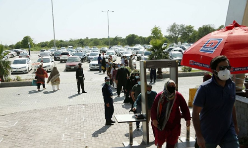 People wait in queue to enter a shopping mall in Islamabad, capital of Pakistan on May 18, 2020. (Xinhua/Ahmad Kamal)