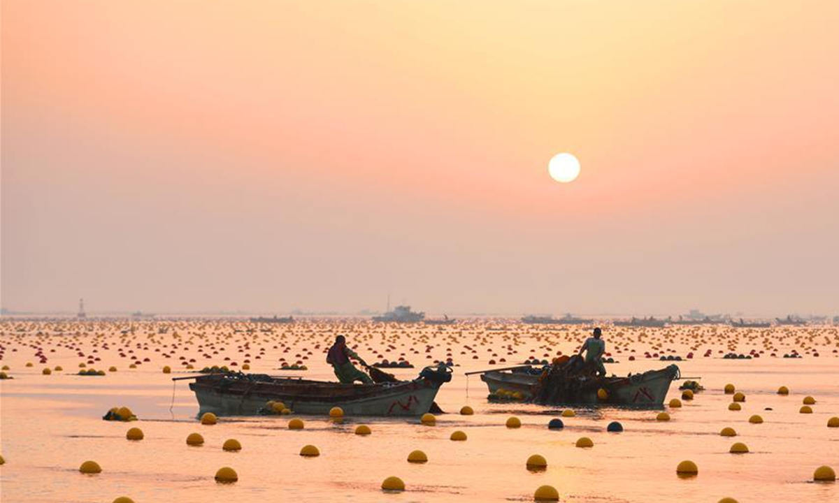 A worker harvests kelp in Lidao Township, Rongcheng, east China's Shandong Province, June 4, 2020. As kelp here has entered harvest season recently, many migrant workers from other provinces returned to Rongcheng to participate in kelp harvest work. (Xinhua/Wang Yang)