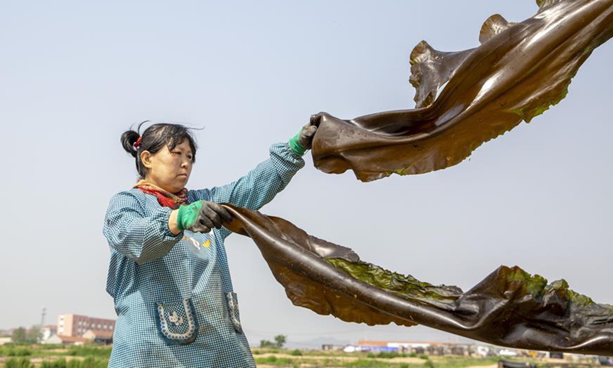 A worker dries kelp in Lidao Township, Rongcheng, east China's Shandong Province, June 4, 2020. As kelp here has entered harvest season recently, many migrant workers from other provinces returned to Rongcheng to participate in kelp harvest work. (Xinhua/Wang Yang)
