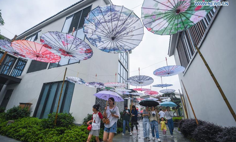 People visit intangible cultural heritage museums on the Pingyao ancient street in Hangzhou, capital of east China's Zhejiang Province, June 6, 2020. Intangible cultural heritage museums on the Pingyao ancient street opened for the public on Saturday. (Xinhua/Xu Yu)