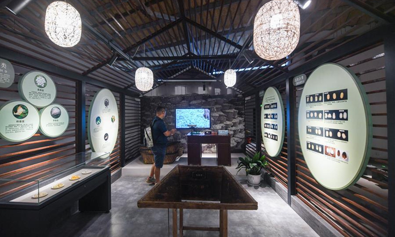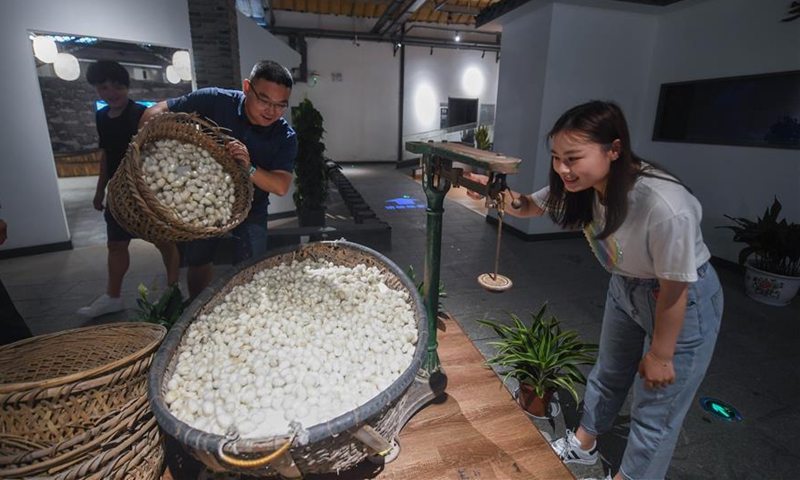 People visit an intangible cultural heritage museum of silkworm culture on the Pingyao ancient street in Hangzhou, capital of east China's Zhejiang Province, June 6, 2020. Intangible cultural heritage museums on the Pingyao ancient street opened for the public on Saturday. (Xinhua/Xu Yu)