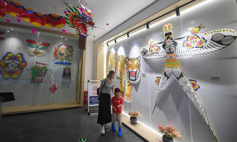 People visit an intangible cultural heritage museum of kites and lanterns on the Pingyao ancient street in Hangzhou, capital of east China's Zhejiang Province, June 6, 2020. Intangible cultural heritage museums on the Pingyao ancient street opened for the public on Saturday. (Xinhua/Xu Yu)