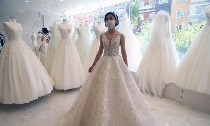 A customer tries on a specially-designed wedding gown with a mask in Ankara, Turkey, on June 6, 2020. The total COVID-19 cases in Turkey surged to 169,218, with 878 new ones added in the past 24 hours, the Turkish Health Minister Fahrettin Koca said on Saturday. (Photo by Mustafa Kaya/Xinhua)