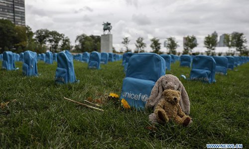 Backpacks are seen as part of a United Nations Children's Fund (UNICEF) installation on the lawn of the United Nations headquarters in New York, on Sept. 10, 2019. The installation features 3,758 backpacks in rows reminiscent of a graveyard, each one representing the loss of a young life to conflict during 2018. The installation, which will run through Sept. 10, is a message to world leaders ahead of the annual United Nations General Assembly and the 30th anniversary of the Convention on the Rights of the Child. (Xinhua/Li Muzi)
