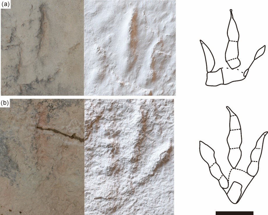 In addition to the large three-toed footprints, the research team led by Wang Xiaolin also found 5 medium-sized tridactyl footprints (two trackways) on the same tracksite, which belong to