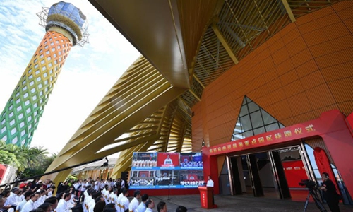 Photo taken on June 3, 2020 shows the unveiling ceremony of key industrial parks, in Haikou, south China's Hainan Province. A batch of key industrial parks were unveiled on Wednesday in China's island province of Hainan, in an effort to promote the construction of the Hainan free-trade port. The 11 key parks around the island cover three major fields, including tourism, modern services and advanced technologies. China on Monday released the development plan for the Hainan free-trade port, aiming to build Hainan into a globally influential, high-level, free-trade port by the middle of the century. (Xinhua/Guo Cheng)