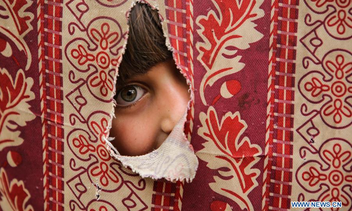 A Palestinian child looks through a hole in a blanket in the Shati refugee camp in Gaza City, June 7, 2020. (Photo by Rizek Abdeljawad/Xinhua)
