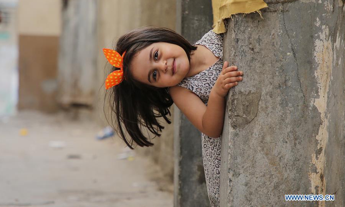 A Palestinian girl plays in the Shati refugee camp in Gaza City, June 7, 2020. (Photo by Rizek Abdeljawad/Xinhua)