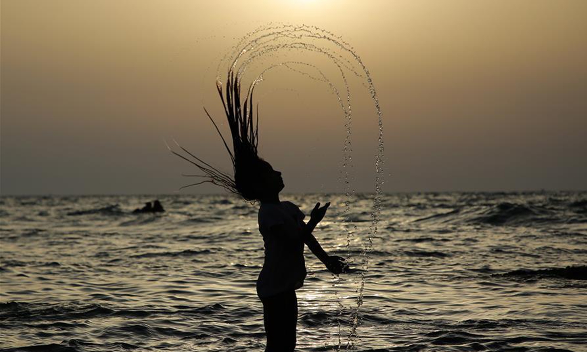 A Palestinian girl enjoys her time during sunset at the seaside in the Shati refugee camp in Gaza City, June 7, 2020. (Photo by Rizek Abdeljawad/Xinhua)