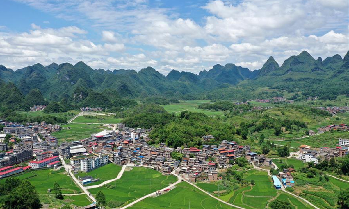 Aerial photo taken on May 25, 2020 shows a view of Chonglou Village in Dacai Township of Huanjiang Maonan Autonomous County, south China's Guangxi Zhuang Autonomous Region. Located in the northwestern part of Guangxi, Huanjiang Maonan Autonomous County is the only autonomous county for the Maonan ethnic group nationwide. The Maonan ethnic group is one of the country's 28 ethnic groups with a smaller population. About 70 percent of Maonan people, or 64,500, live in Huanjiang County. The poverty headcount ratio in Huanjiang dropped to 1.48 percent by the end of last year. The county was removed from the country's list of impoverished counties in May. Based on the Maonan people's poverty alleviation situation across the country, the ethnic group has gotten rid of poverty as a whole. (Xinhua/Zhou Hua)