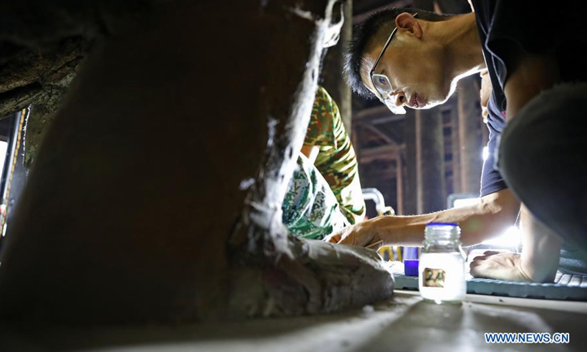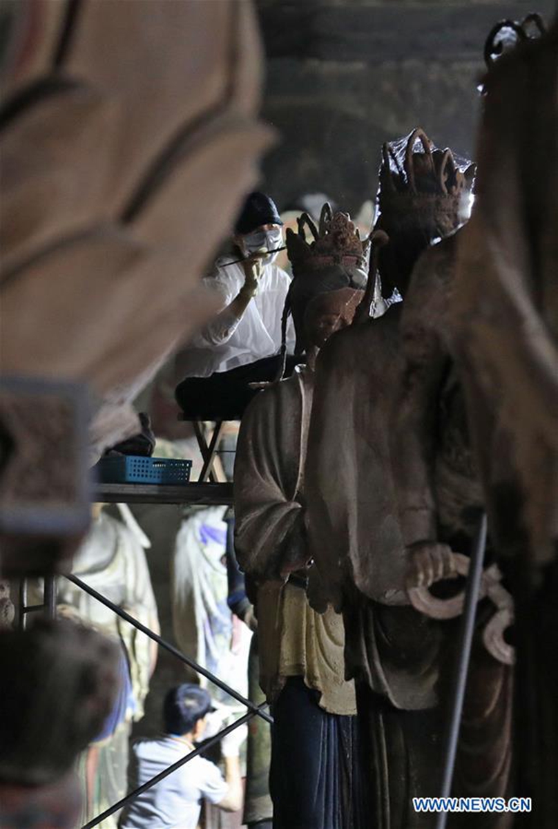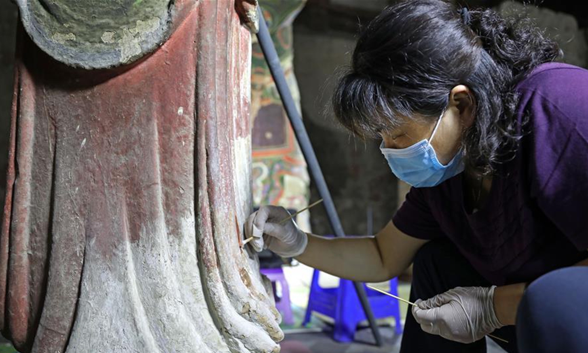 Relic conservation experts restore colour-painted clay sculptures at Fengguo Monastery in Yixian County of Jinzhou, northeast China's Liaoning Province, June 8, 2020. Built in 1020, Fengguo Monastery hosts a rare collection of colour-painted Buddhist clay sculptures. In 2012, the "Main Hall of Fengguo Monastery" was submitted by China to the UNESCO World Heritage Tentative Lists. (Xinhua/Yao Jianfeng)