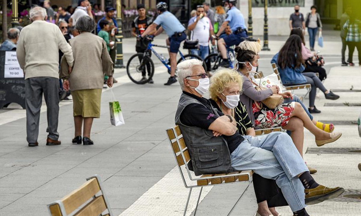 An elderly couple wearing face masks sit on a bench in the main square of Skopje, capital of North Macedonia, on June 8, 2020. (Photo by Tomislav Georgiev/Xinhua)