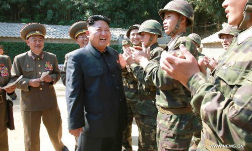 Photo provided by DPRK's official news agency KCNA on July 15, 2014 shows top leader of the Democratic People's Republic of Korea (DPRK) Kim Jong Un (C) meeting with soldiers in the shell firing exercise of the army. Top leader of the DPRK Kim Jong Un guided a live shell firing exercise of the Unit 171 of the Korean People's Army (KPA), DPRK's official news agency KCNA reported Tuesday. (Xinhua/KCNA)