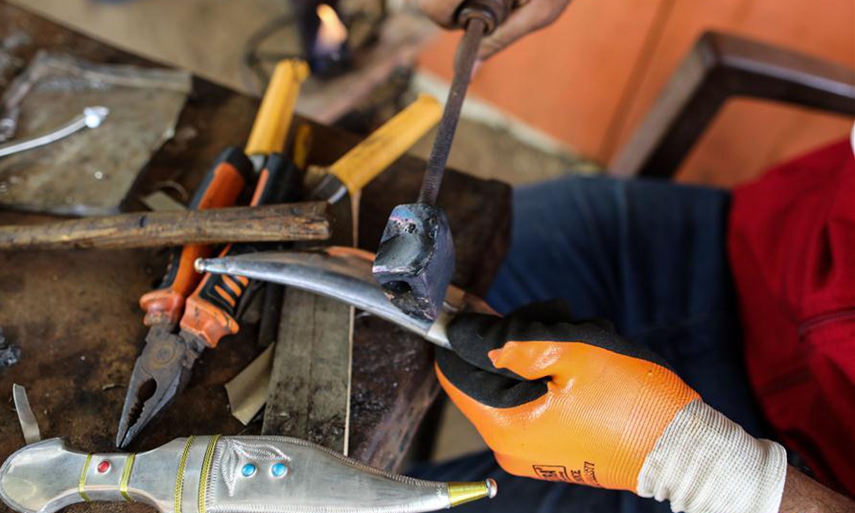 A Palestinian craftsman makes a traditional dagger at a workshop inside his house in the southern Gaza Strip city of Khan Younis, on June 9, 2020. (Photo by Yasser Qudih/Xinhua)