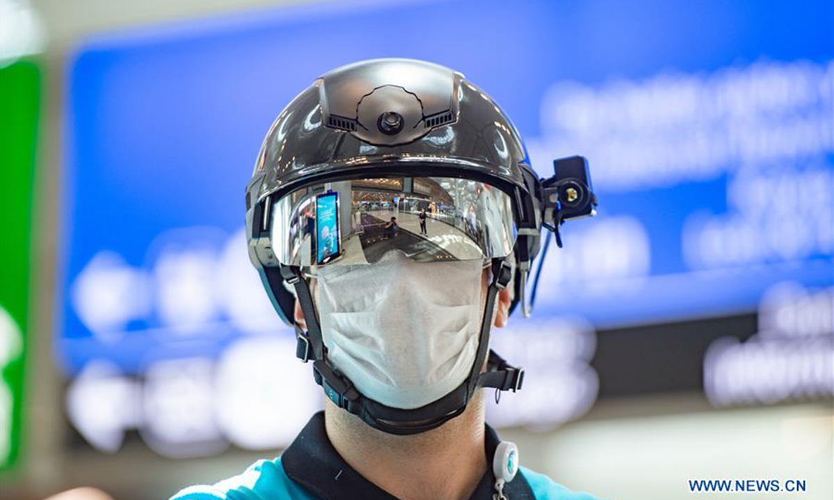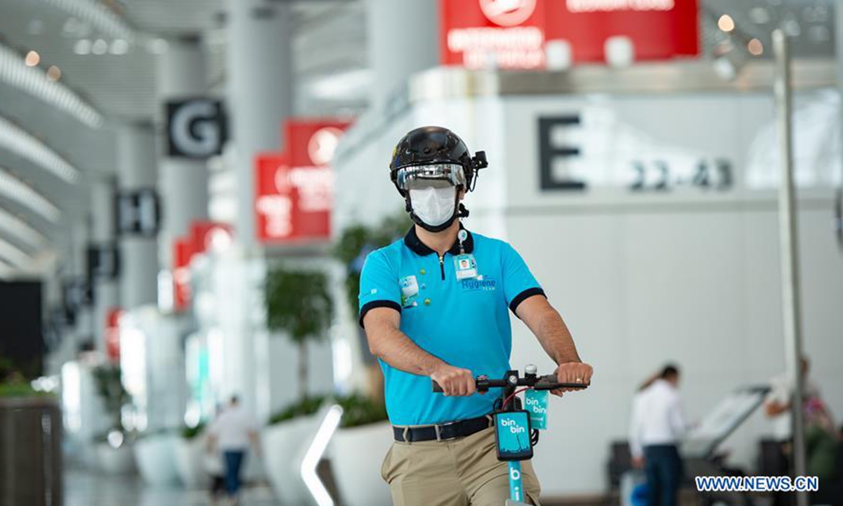 An employee wearing a thermal imaging VF helmet monitors people at the Istanbul Airport in Istanbul, Turkey, on June 9, 2020. Technology and innovation will top the precautions of Turkey's biggest airport Istanbul Airport against the COVID-19 in the post-pandemic era, according to the management of the airport. The management on Tuesday presented their final preparations and measures taken against coronavirus while Turkish airline companies are preparing to resume their international operations the next day. (Photo by Yasin Akgul/Xinhua)