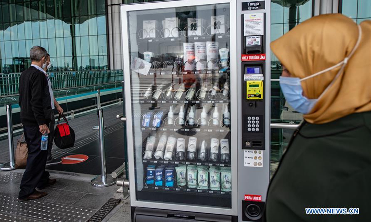 A vending machine for selling protective products is seen at the Istanbul Airport in Istanbul, Turkey, on June 9, 2020. Technology and innovation will top the precautions of Turkey's biggest airport Istanbul Airport against the COVID-19 in the post-pandemic era, according to the management of the airport. The management on Tuesday presented their final preparations and measures taken against coronavirus while Turkish airline companies are preparing to resume their international operations the next day. (Photo by Yasin Akgul/Xinhua)