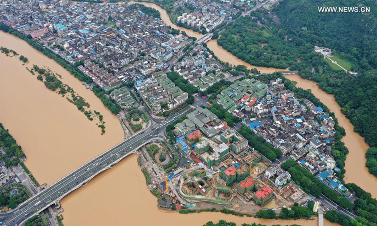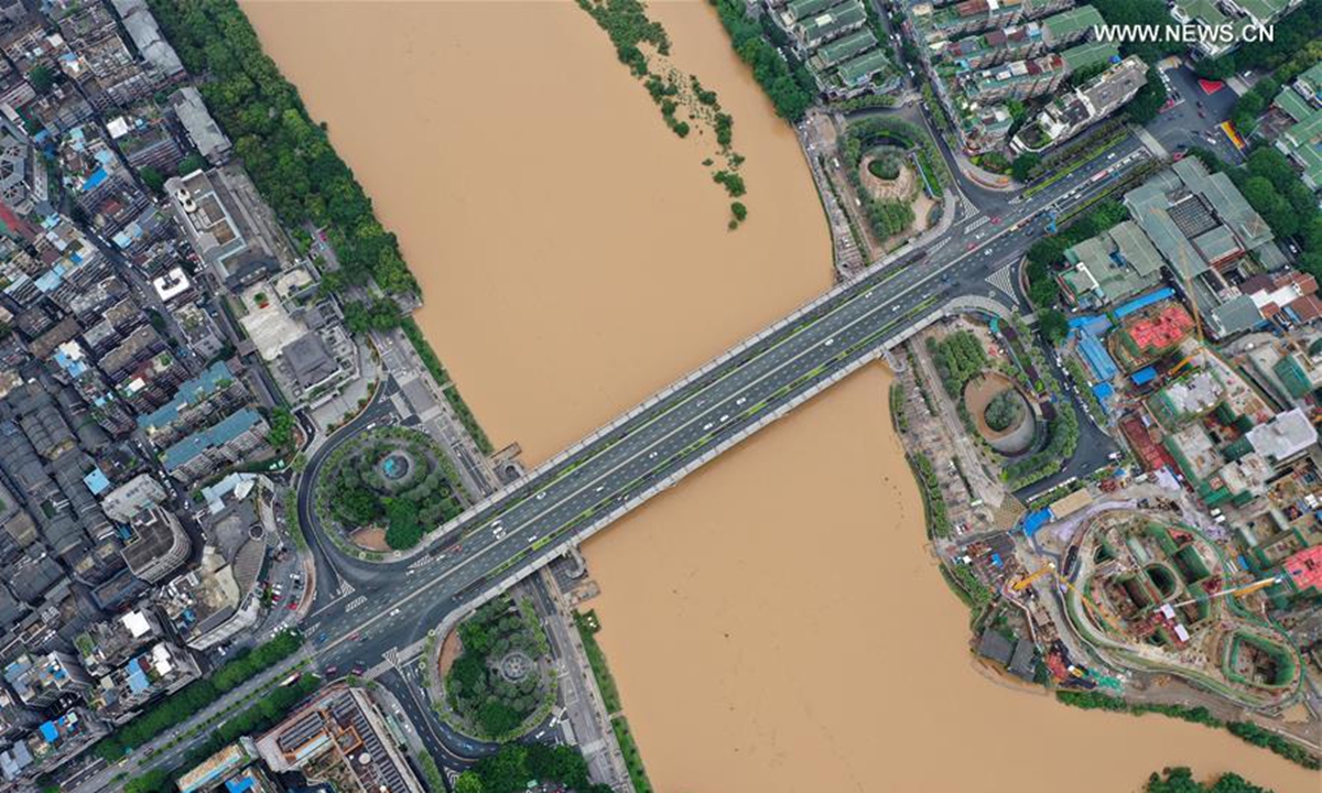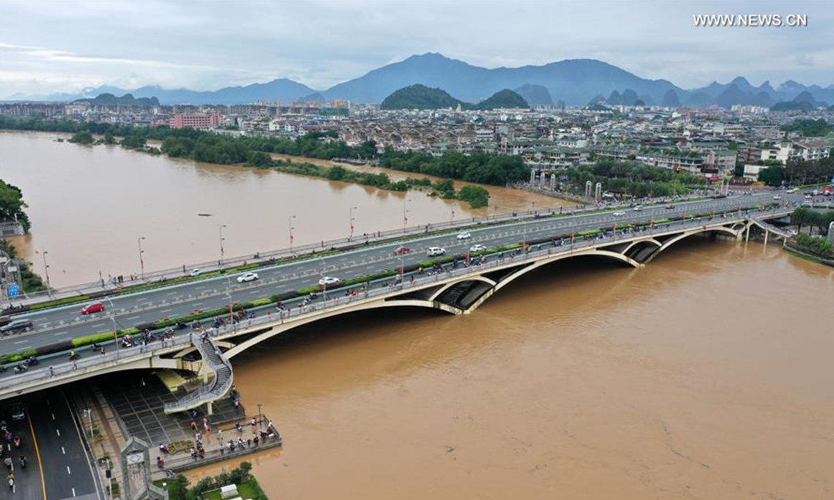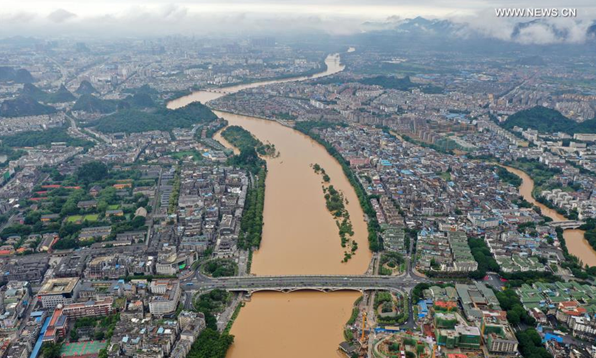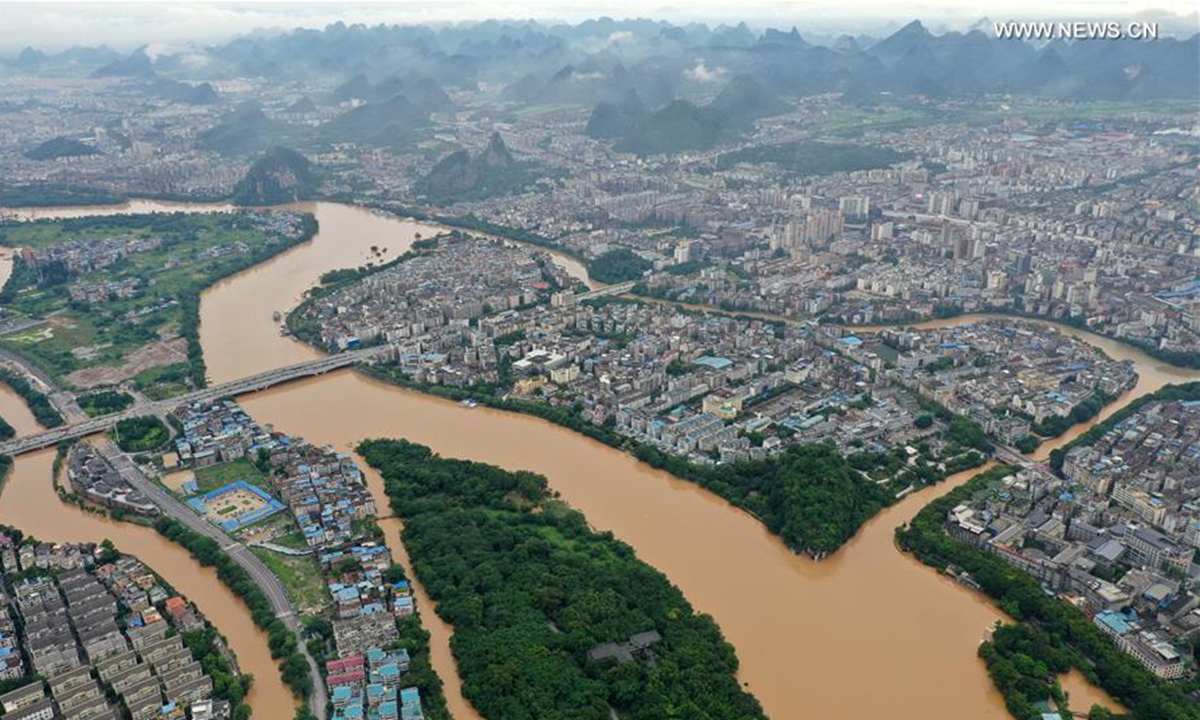 Aerial photo taken on June 9, 2020 shows a view of Guilin City in south China's Guangxi Zhuang Autonomous Region. Due to continuous torrential rain, the Lijiang River witnessed a flood peak Tuesday noon, with the highest water level reaching 146.49 meters, 0.49 meters above the warning line. (Xinhua/Lu Boan)