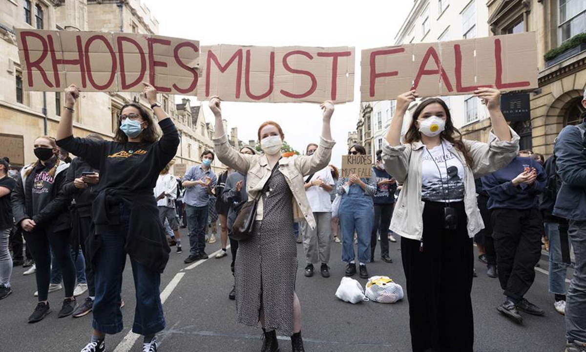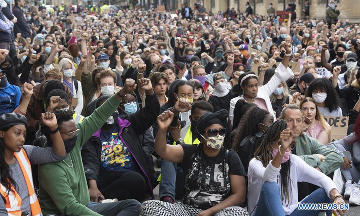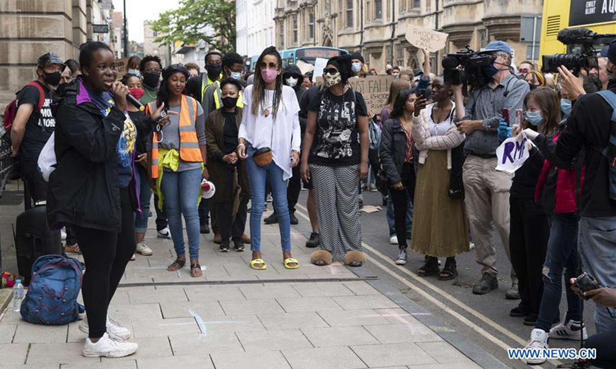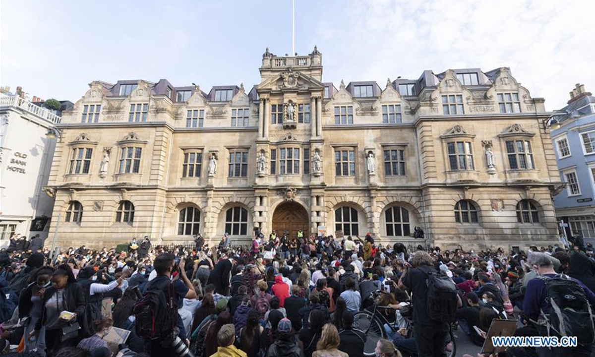 Demonstrators take part in a protest demanding Oxford University to remove the statue of Cecil Rhodes outside Oriel College in Oxford, Britain on June 9, 2020. According to local media, hundreds of Black Lives Matter protesters gathered in Oxford to call for a statue of Cecil Rhodes to be pulled down, following the toppling of a statue of 17th-century slave trader Edward Colston during a protest in Bristol last Sunday. (Photo by Ray Tang/Xinhua)