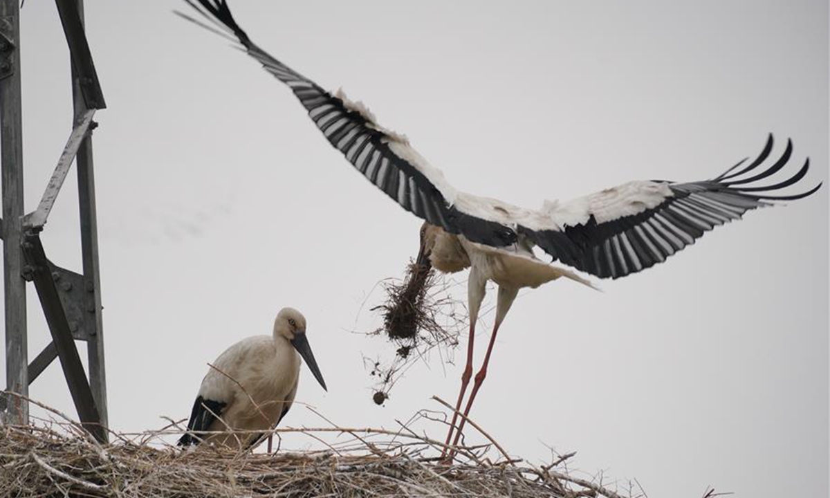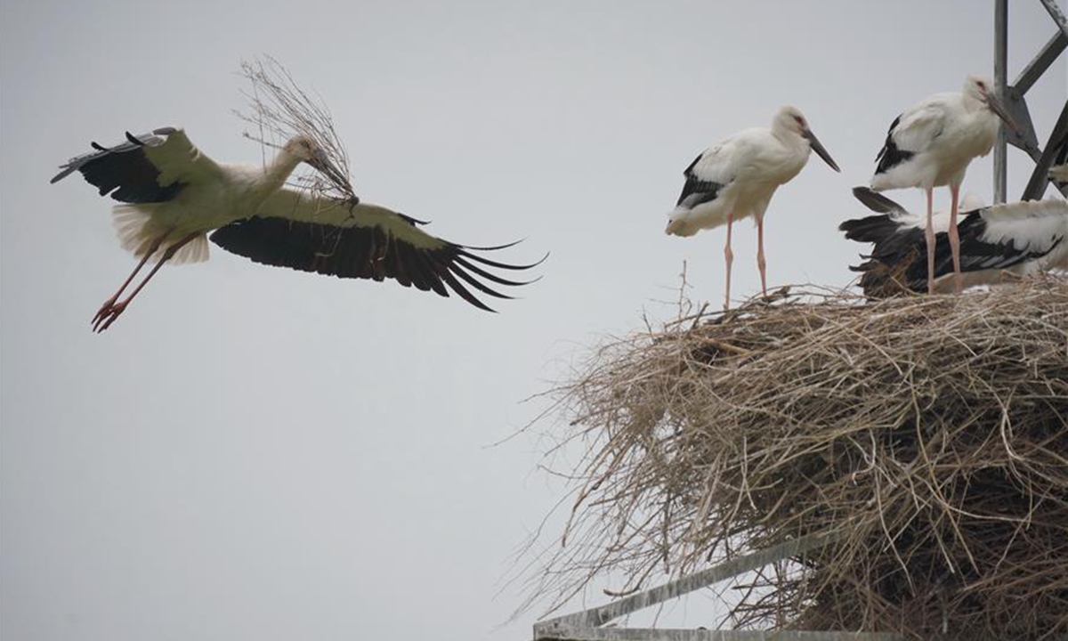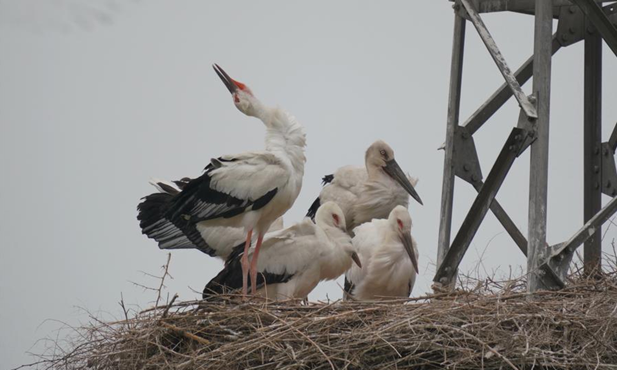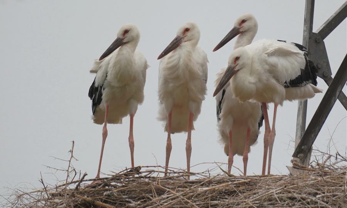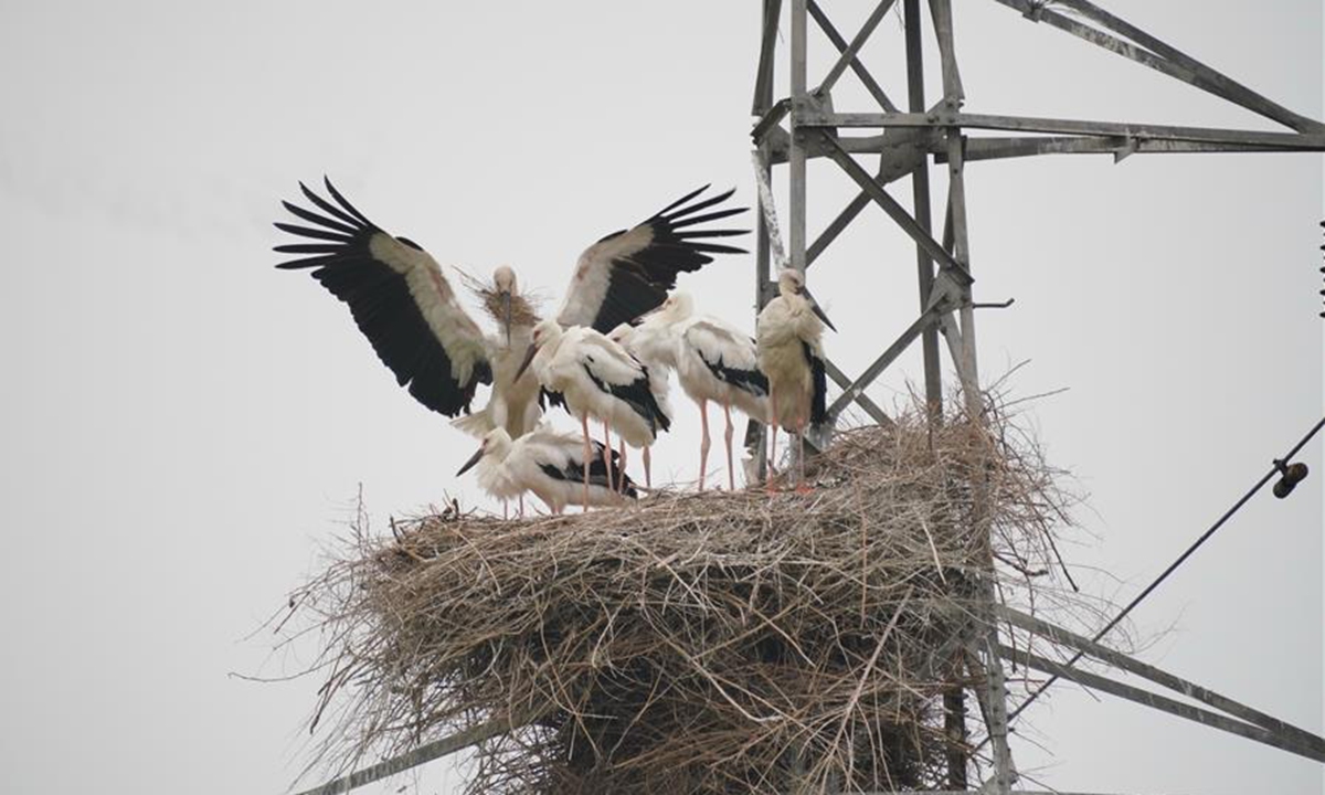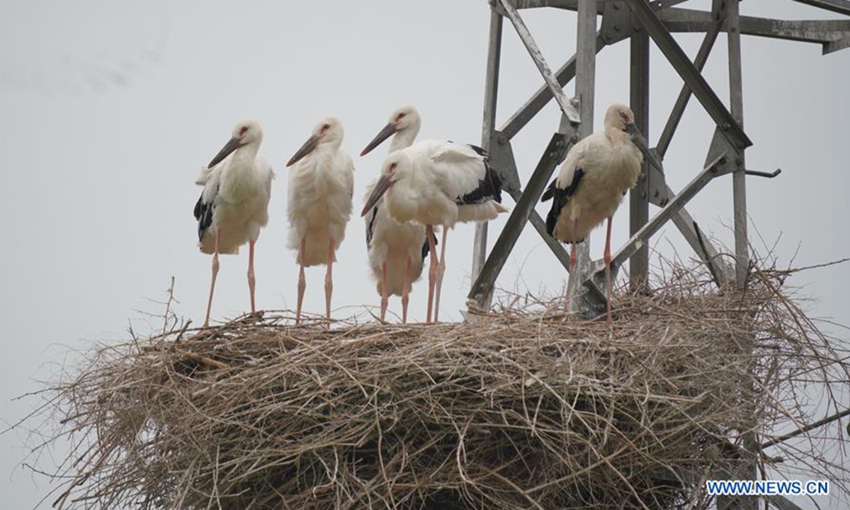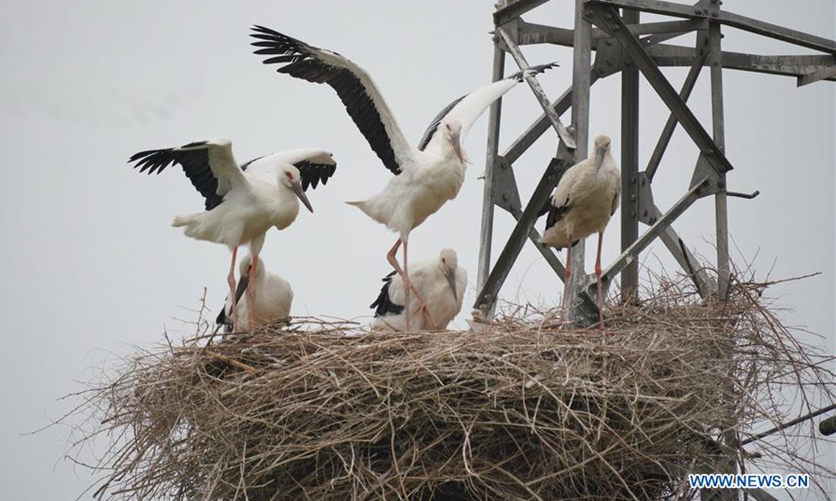 Photo taken on June 9, 2020 shows oriental white storks in their nest at a coastal wetland in Fengnan District of Tangshan, north China's Hebei Province. Eight oriental white stork couples had nested at the wetland and incubated 17 nestlings here. The oriental white stork is under first-class national protection in China and listed as endangered by the International Union for Conservation of Nature. (Xinhua/Yang Shiyao)