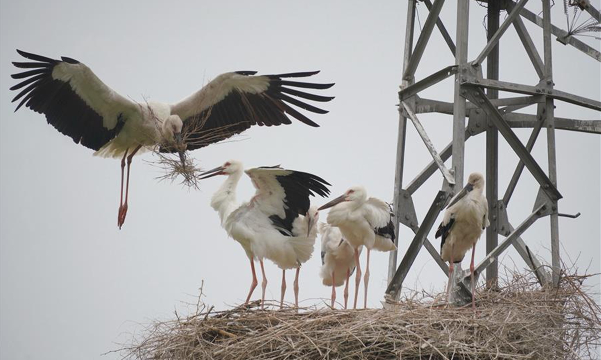 Photo taken on June 9, 2020 shows a parent oriental white stork (1st L) nesting at a coastal wetland in Fengnan District of Tangshan, north China's Hebei Province. Eight oriental white stork couples had nested at the wetland and incubated 17 nestlings here. The oriental white stork is under first-class national protection in China and listed as endangered by the International Union for Conservation of Nature. (Xinhua/Yang Shiyao)