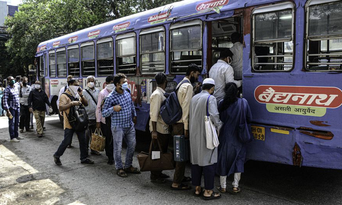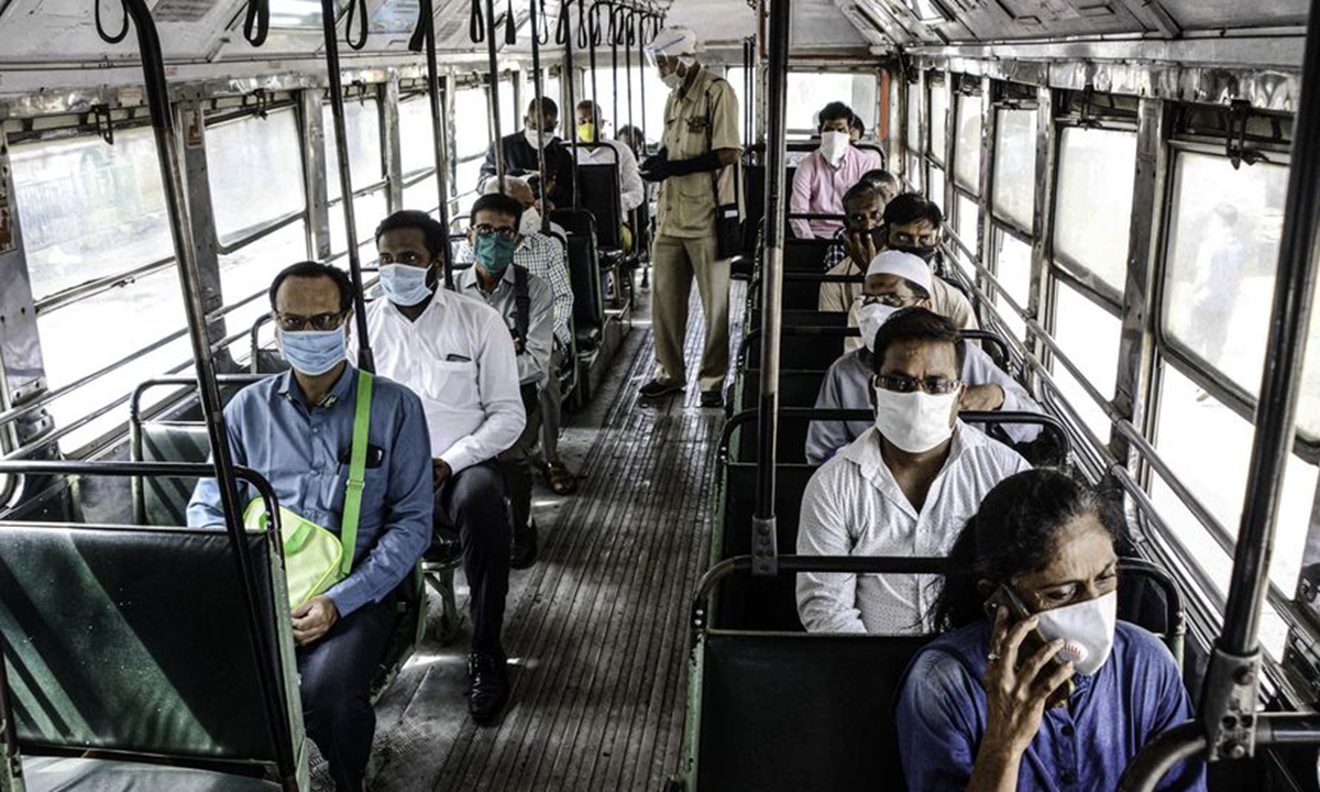 Indian commuters wearing protective face masks travel on a public bus during rush hour as the lockdown eases in Mumbai on June 9, 2020. (Xinhua/Stringer)
