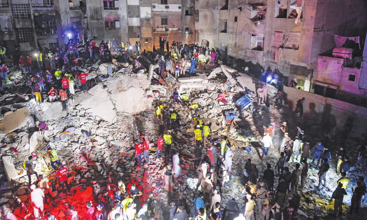 In this photo taken on Sunday, rescue workers and residents search for victims in the rubble of a collapsed five-story residential building in Karachi, Pakistan. At least two people were killed and eight others were injured. Photo: AFP