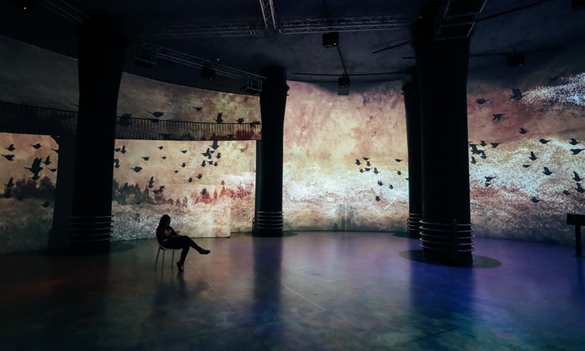 Photo taken on June 10, 2020 shows a view of the "Claude Monet: The Immersive Experience" exhibition at Horta Gallery in Brussels, Belgium. With a sound and light show as well as virtual reality technology, the exhibition provides audience with immersive experience to appreciate the works and inspirations of Claude Monet. The exhibition will last until Sept. 6. (Xinhua/Zhang Cheng)