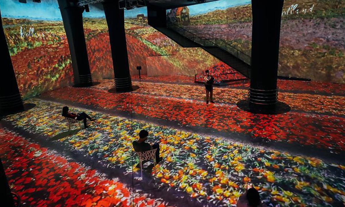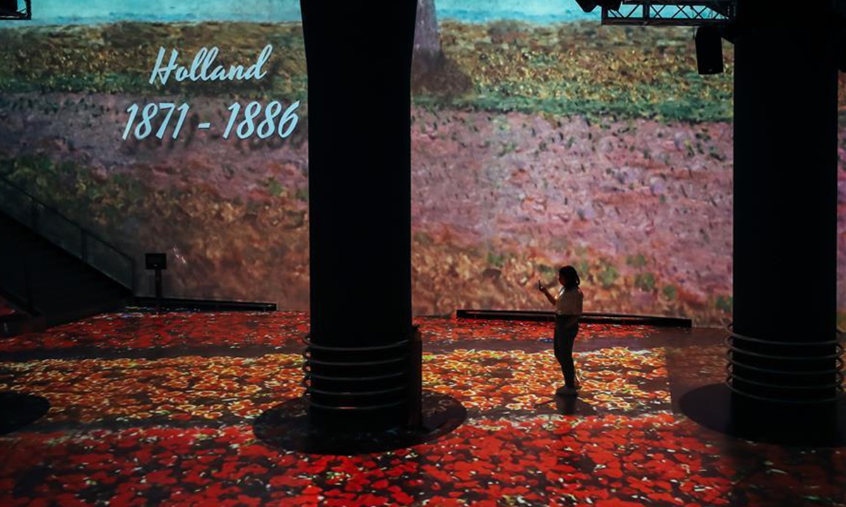A woman views "Claude Monet: The Immersive Experience" exhibition at Horta Gallery in Brussels, Belgium, on June 10, 2020. With a sound and light show as well as virtual reality technology, the exhibition provides audience with immersive experience to appreciate the works and inspirations of Claude Monet. The exhibition will last until Sept. 6. (Xinhua/Zhang Cheng)