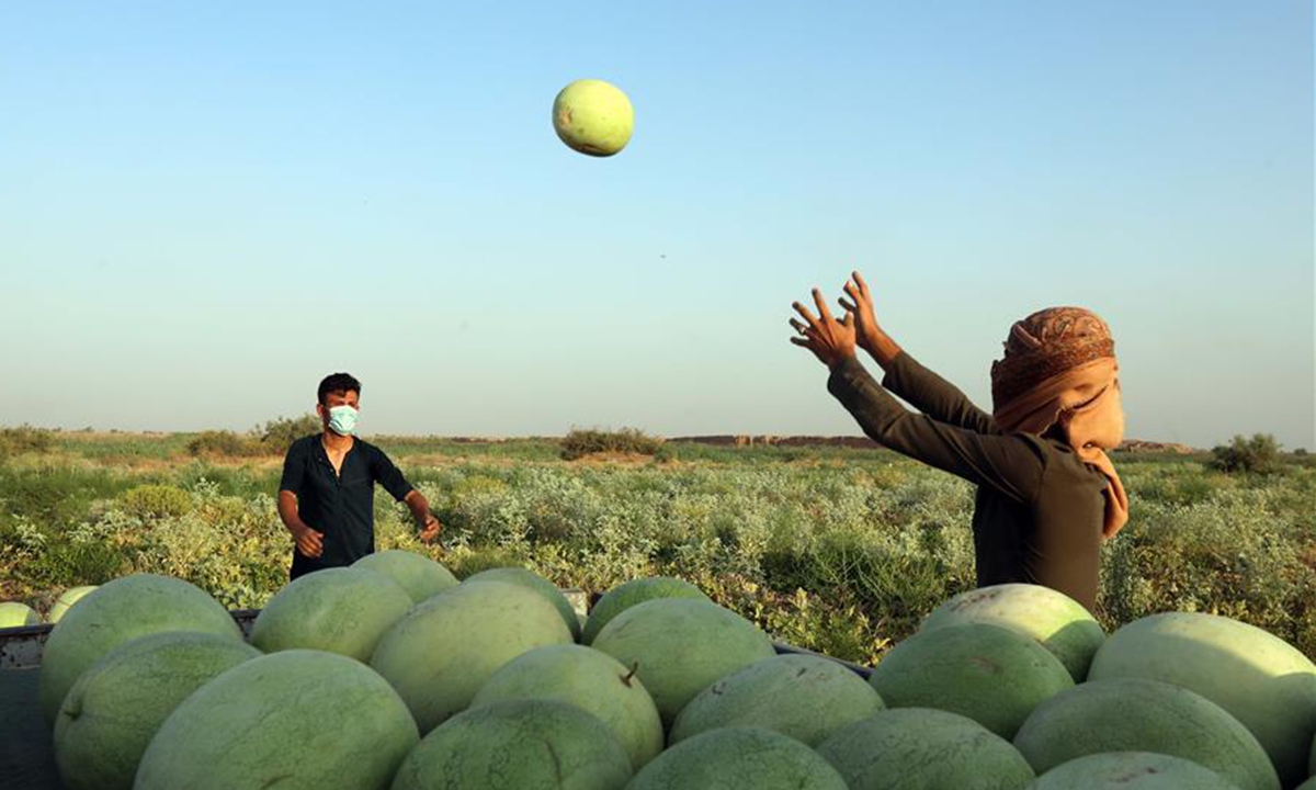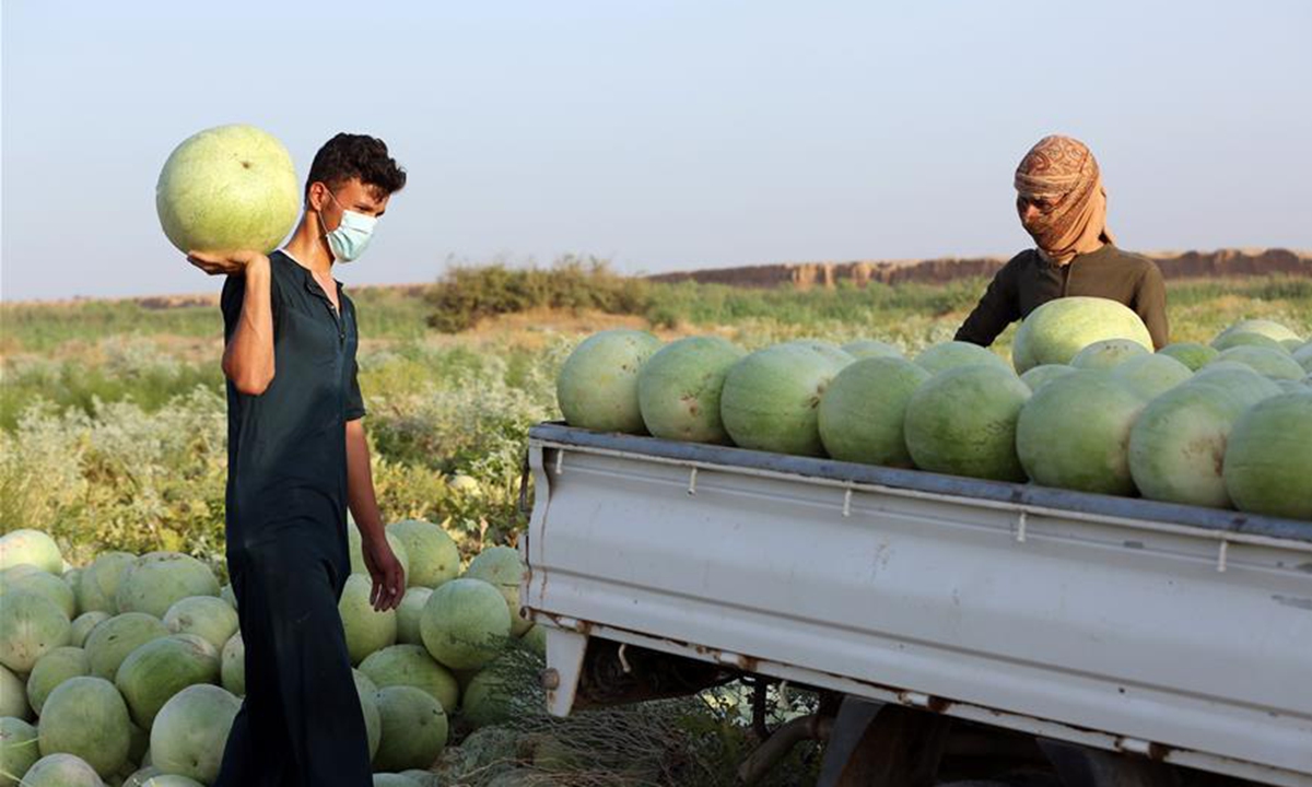 Farmers harvest watermelons in suburb of Baghdad, Iraq, on June 9, 2020. Farmers planting watermelon in Baghdad's suburb area face difficulties in sale during the COVID-19 pandemic. (Xinhua)