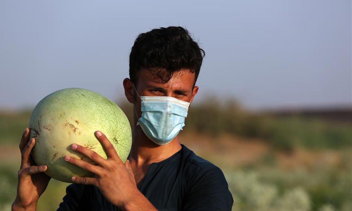A farmer holds a watermelon in the fields in suburb of Baghdad, Iraq, on June 9, 2020. Farmers planting watermelon in Baghdad's suburb area face difficulties in sale during the COVID-19 pandemic. (Xinhua)