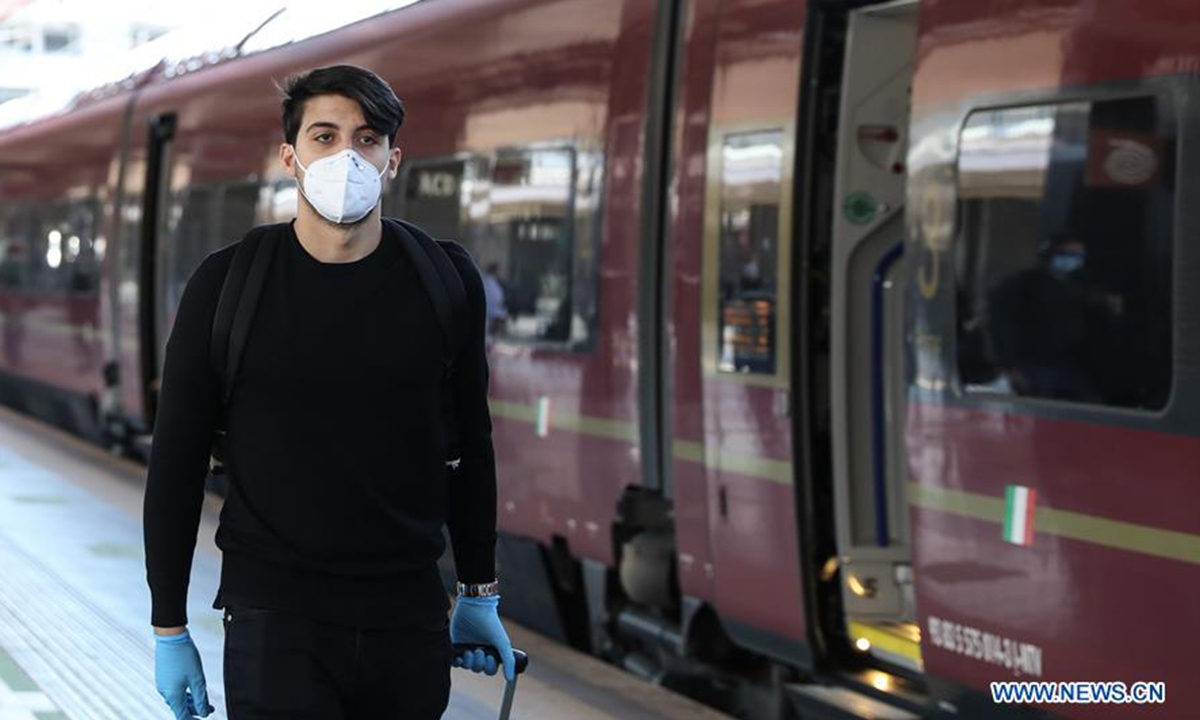 A passenger wearing a face mask and gloves walks at Roma Termini Train Station in Rome, Italy, June 3, 2020. Italy's active infections of coronavirus fell below 40,000 for the first time since March 20 on Tuesday, just a day before the lifting of movement restrictions between Italian regions, figures of the Civil Protection Department showed. Also starting on Wednesday, Italy will open its borders without restriction to travelers from the other 25 Schengen countries, including the countries with high infection rates. (Xinhua/Cheng Tingting)