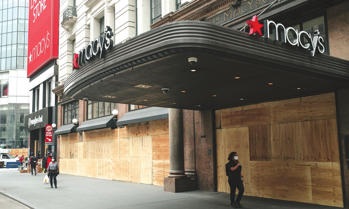 Pedestrians walk by the Macy's flagship store after workers cleaned and boarded up damage sustained during a night of violent protests and looting in Midtown, Manhattan on June 2 in New York City, the US. Photo: AFP
