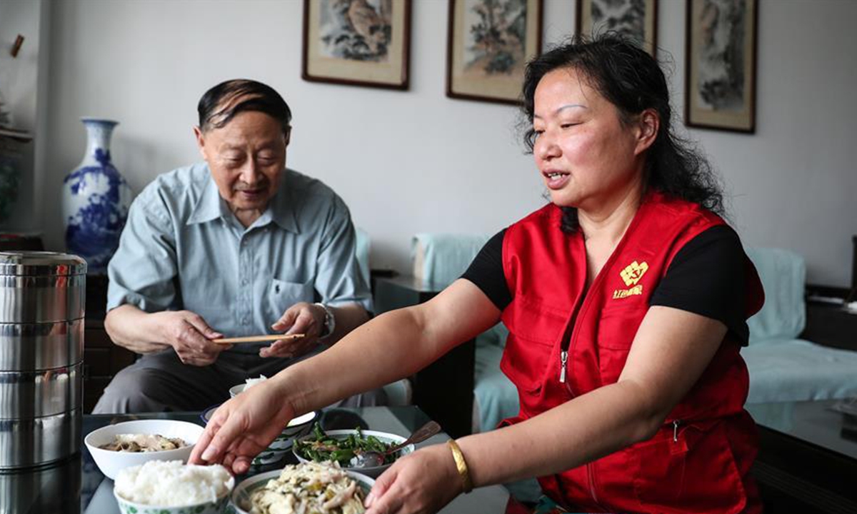 Wu Siqin (L), an 84-year-old resident of Fengnanlu Community, receives food delivered by social worker Wang Linying in Suzhou, east China's Jiangsu Province, June 11, 2020. Loufeng Community of Suzhou industrial park offers meal delivery service to elderly people living in the community, a move to bring more convenience to the aged. (Xinhua/Yang Lei)
