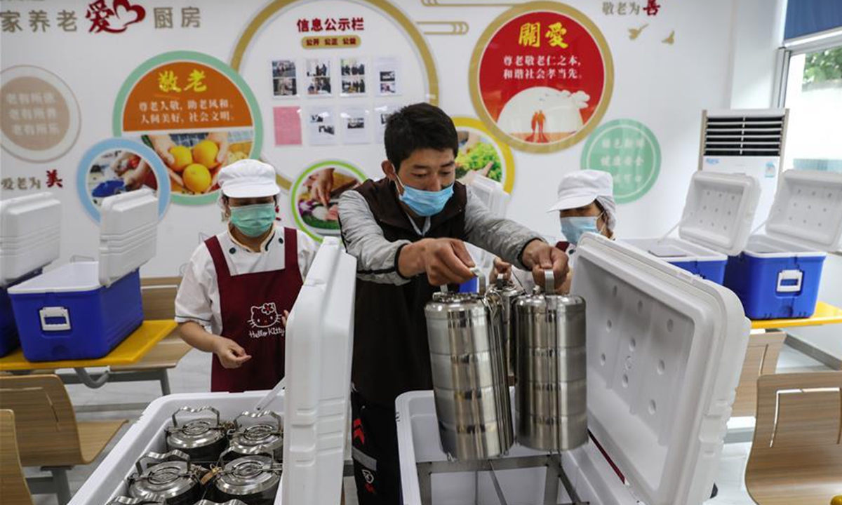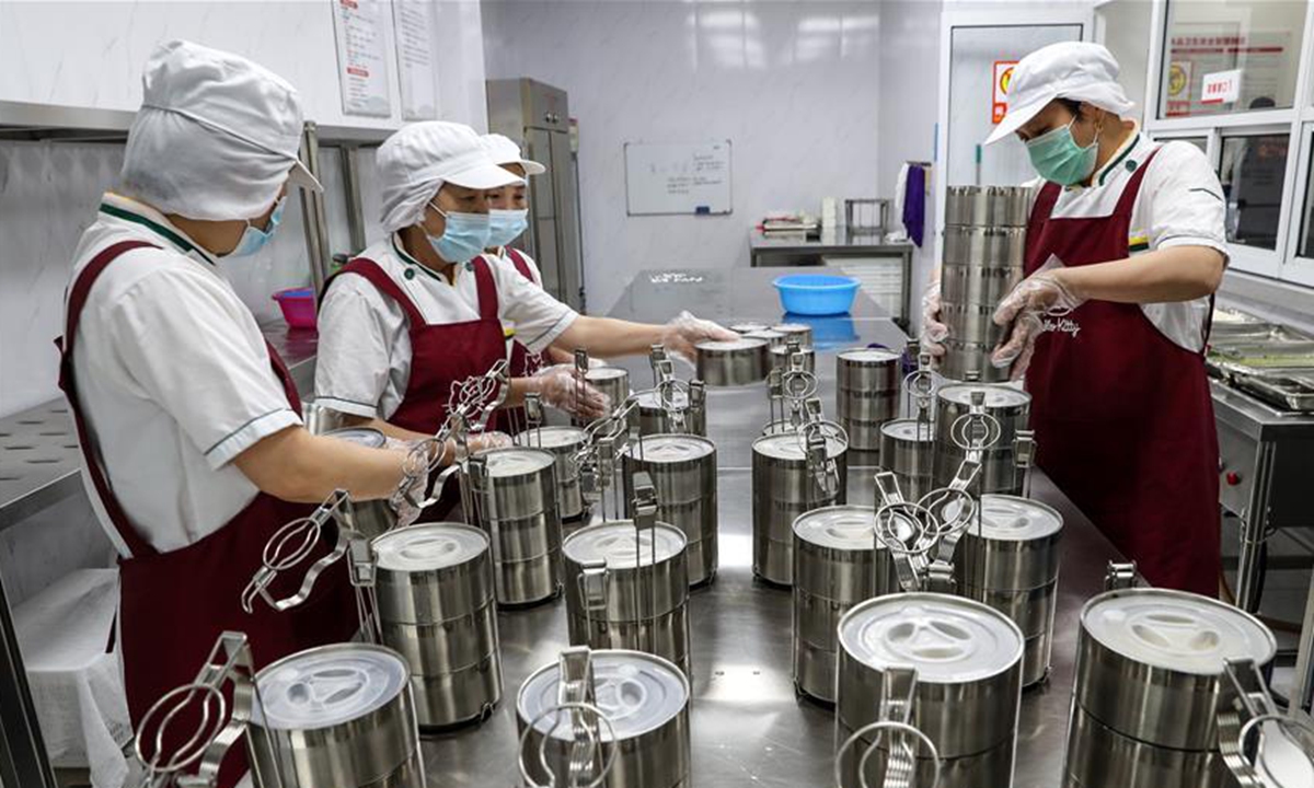 Chefs of a community kitchen prepare to put food into lunchbox in Suzhou, east China's Jiangsu Province, June 11, 2020. Loufeng Community of Suzhou industrial park offers meal delivery service to elderly people living in the community, a move to bring more convenience to the aged. (Xinhua/Yang Lei)