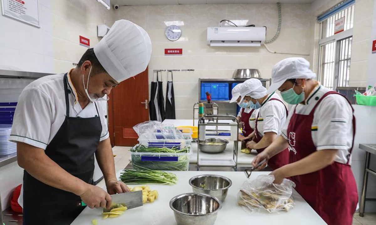 Chefs of a community kitchen prepare food in Suzhou, east China's Jiangsu Province, June 11, 2020. Loufeng Community of Suzhou industrial park offers meal delivery service to elderly people living in the community, a move to bring more convenience to the aged. (Xinhua/Yang Lei)