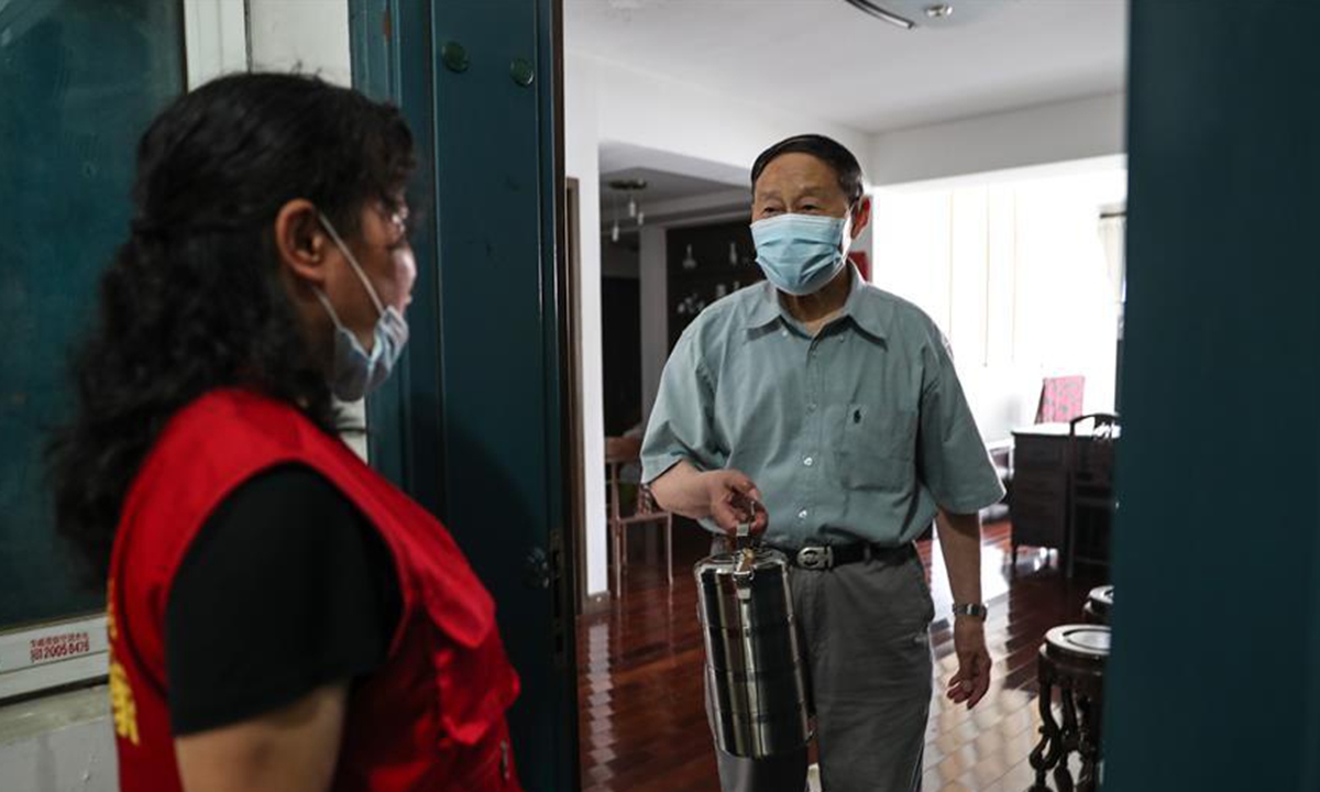 Wu Siqin (R), an 84-year-old resident of Fengnanlu Community, receives food delivered by social worker Wang Linying in Suzhou, east China's Jiangsu Province, June 11, 2020. Loufeng Community of Suzhou industrial park offers meal delivery service to elderly people living in the community, a move to bring more convenience to the aged. (Xinhua/Yang Lei)