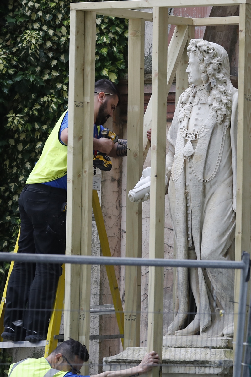 Workers construct a barrier around the statue of Sir Robert Clayton, who had links to the slave trade, at Guy's and St. Thomas Hospital, in London on Friday. Photo: AFP